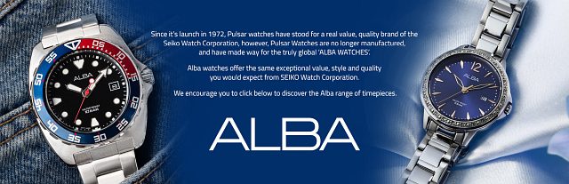 Since it's launch in 1972, Pulsar watches have stood for a real value, quality brand of the Seiko Watch Corporation, however, Pulsar Watches are no longer manufactured, and have made way for the truly global 'ALBA WATCHES'. Alba watches offer the same exceptional value, style and quality you would expect from SEIKO Watch Corporation. We encourage you to click below to discover the Alba range of timepieces.
