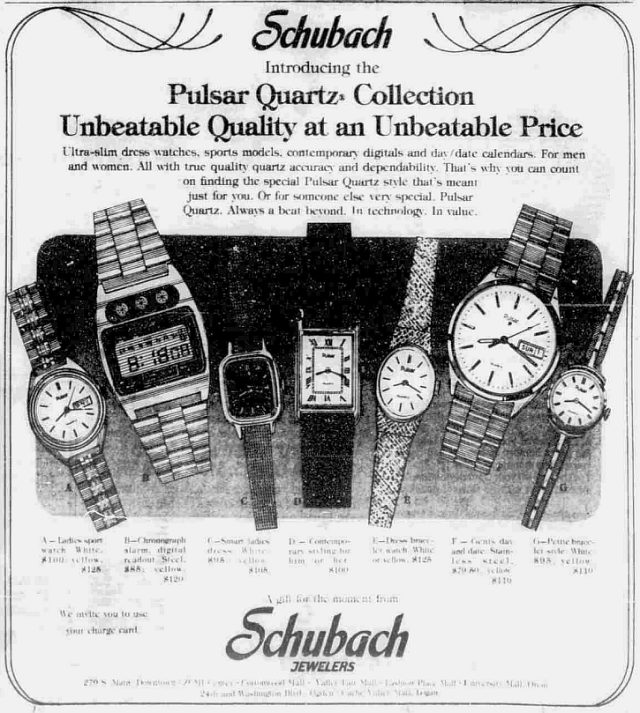 About a year after the sale of the Pulsar name to Seiko, ads began appearing in newspapers across the country. This example from Shubach Jewelers was spotted in the October 3, 1979 issue of the Salt Lake Tribune, page 6A. Seven different Pulsar models are shown.